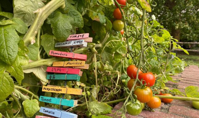 Fair’s fair; if we were going to call it an LUCL garden, it had better be at least a little bit language-related. Luckily, we landed on a perfect idea: each crop would get a collection of name tags providing its name in a variety of languages. And just to add an interactive element, people could add their own language to the collection, on one of the colourful clothes pegs provided. A huge success! Not only did people get straight to the naming game (Sophia spent multiple weekends painting more clothes pegs to meet demand), but the name tags also added a wonderful colourful touch to the garden.
